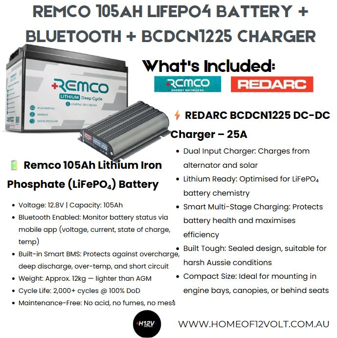 REMCO 105AH LIFEPO4 BATTERY + BLUETOOTH + BCDCN1225 CHARGER