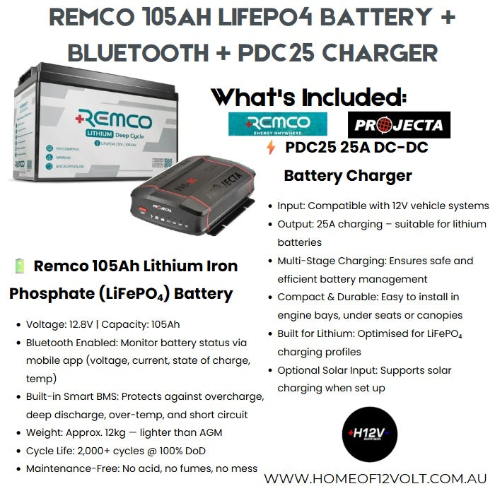 Power up your 12V system with confidence using this efficient and space-saving bundle — featuring the Remco 105Ah LiFePO₄ Battery with Bluetooth and the dependable PDC25 25A DC-DC Battery Charger. It’s the ideal match for 4WD setups, camper trailers, and off-grid adventures where smart power and simplicity matter.
