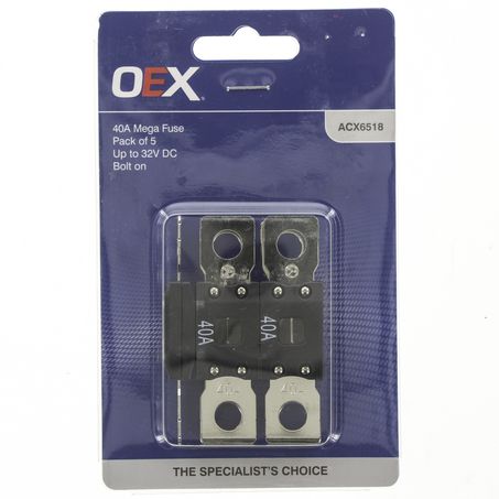 • OEX Mega Fuse, Bolt On• Amp: 40A• 32V DC• Type: SF51• Copper Tin Plated• Mounting: centre to centre 50.8mm• Available in a single pack & 5 pack