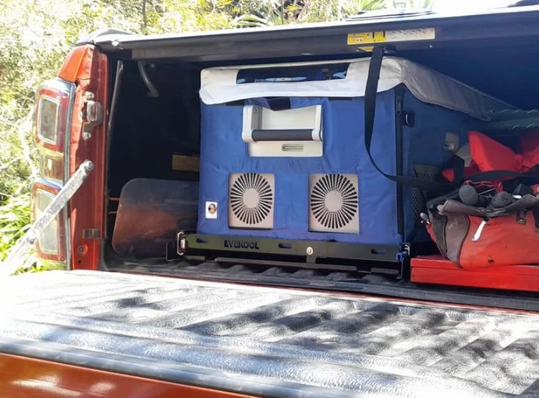 Fits most utes with a roller or hard-top cover. The fridge is 413mm in total height. If you’re wanting to add a fridge slide, our large heavy-duty fridge slide would add an extra 35mm making the total height 448mm!