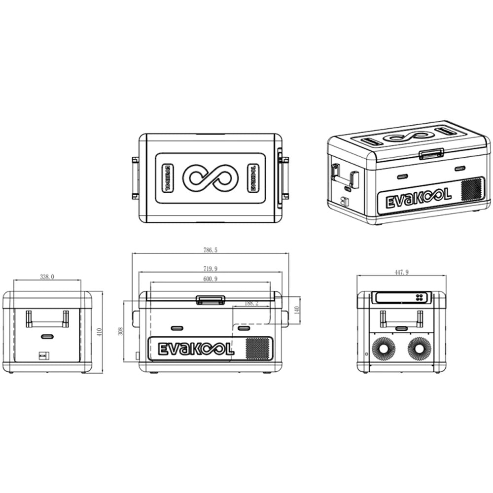 Length: 786mm (719mm without handles) Width: 448mm Height: 410mm |