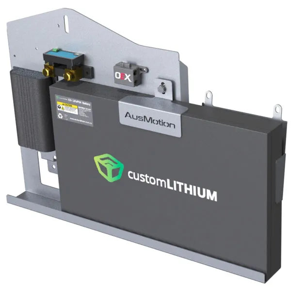 This product has been designed to mount the 100Ah Ultra-Slim metal case Lithium battery from Custom Lithium or the super-slim 100Ah battery from iTech World (SKU: ITECH100SS)