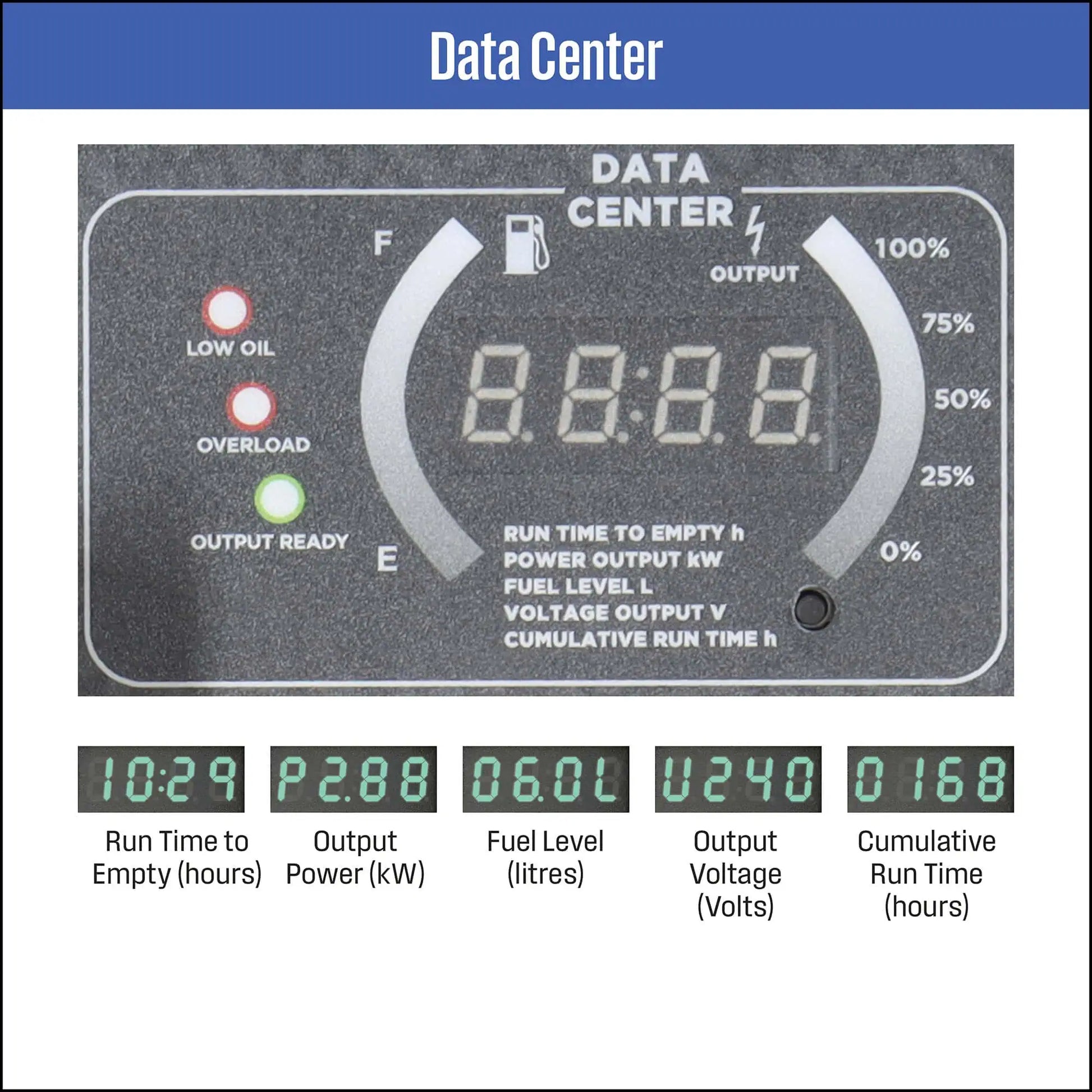 | Data Centre Display | Output Power & Voltage, Fuel Level, Fuel & Cumulative Run Times |